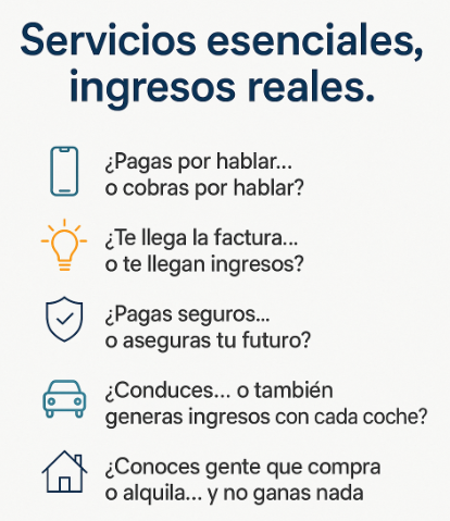 NOTA: Cada uno de estos servicios esenciales —electricidad, gas, telefonía, internet, seguros, hipotecas, seguridad, venta de coches e inmobiliaria— ya representa un negocio formidable por sí solo, ¡y además te permite ahorrar en tus propias facturas desde el primer día!.